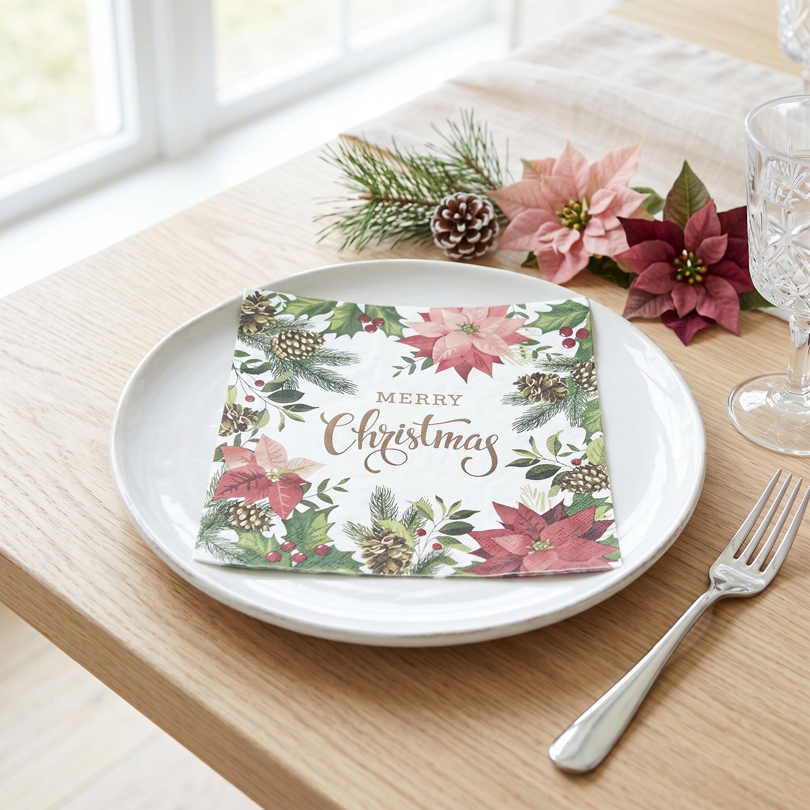 Festive holiday-themed paper napkins with a natural watercolor print of pinecones, holly berries and poinsettias, featuring the elegant “Merry Christmas” lettering. Soft, absorbent and disposable, perfect for adding a warm, rustic holiday touch to your Christmas dinner table.