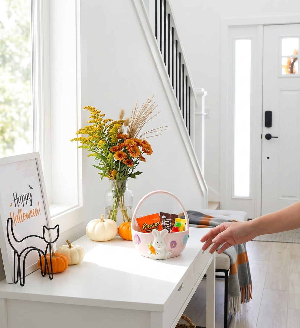 Bring adorable, springtime charm to your home with this whimsical hand-painted ceramic bunny basket bowl!