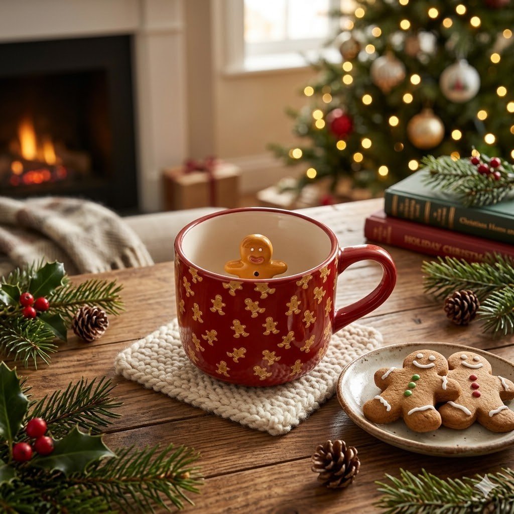Handcrafted-A delightful surprise in every sip! This charming ceramic mug features a cute 3D gingerbread man figurine hidden inside, paired with a festive red exterior printed with tiny gingerbread motifs.