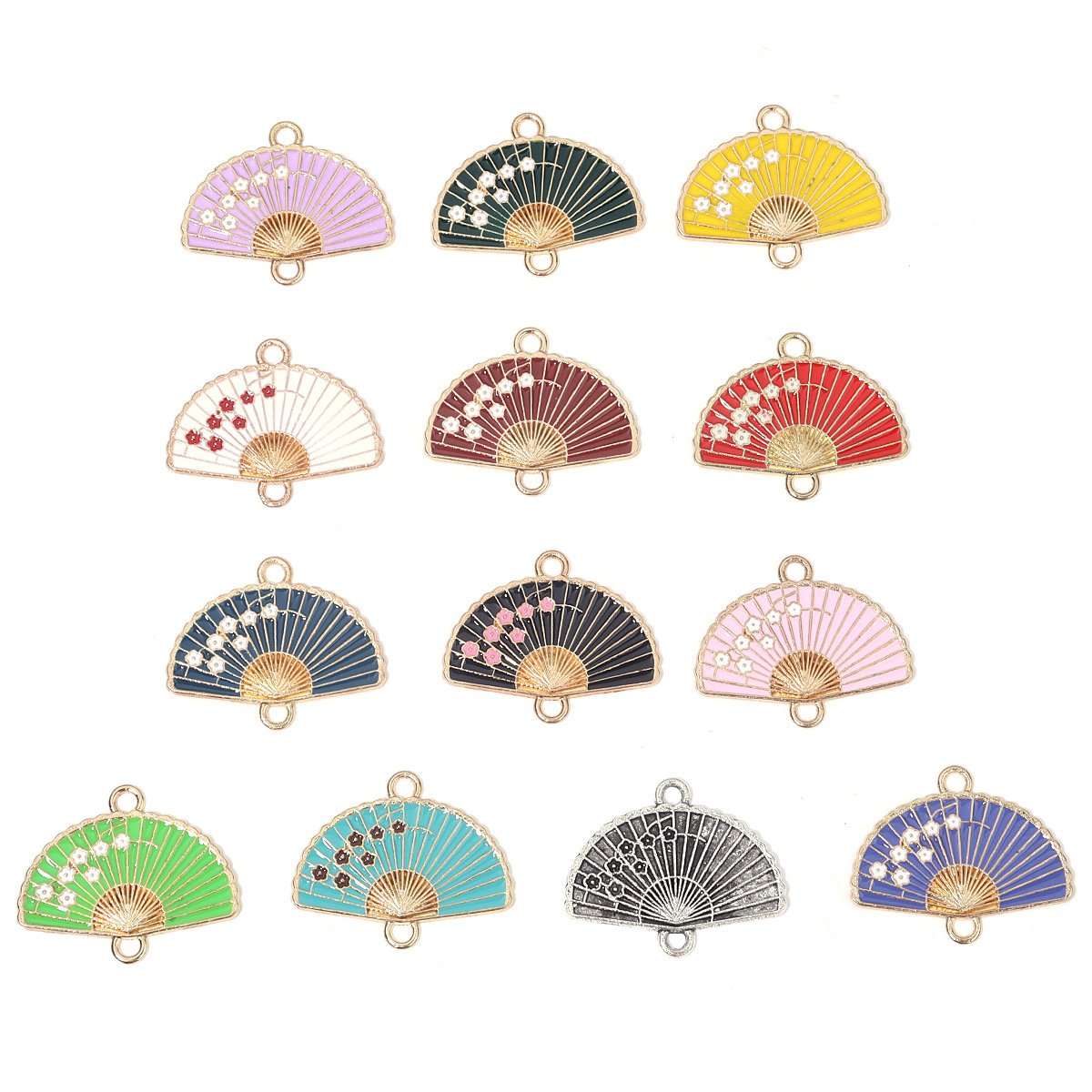 Elegant oriental folding fan shape enamel alloy pendants, with delicate plum blossom pattern and polished golden trim. Bright colorfast enamel finish, each style comes with 2 pieces, total 20 assorted pieces per pack. Easy to hang and DIY assemble, perfect for personalized wine glass distinguishing marks at party gatherings and handmade craft decorations.