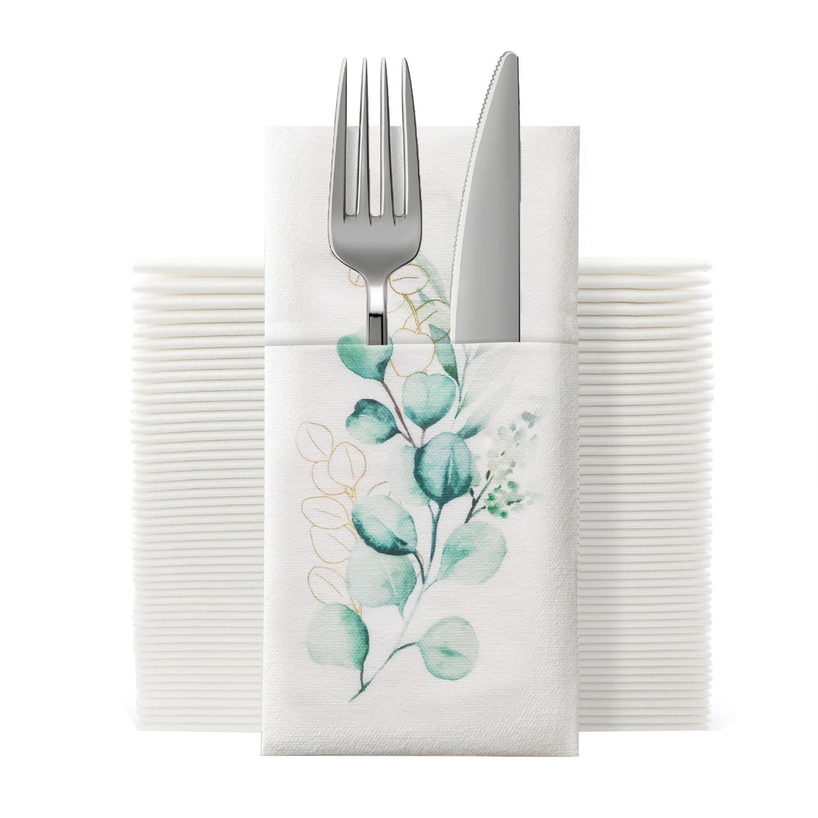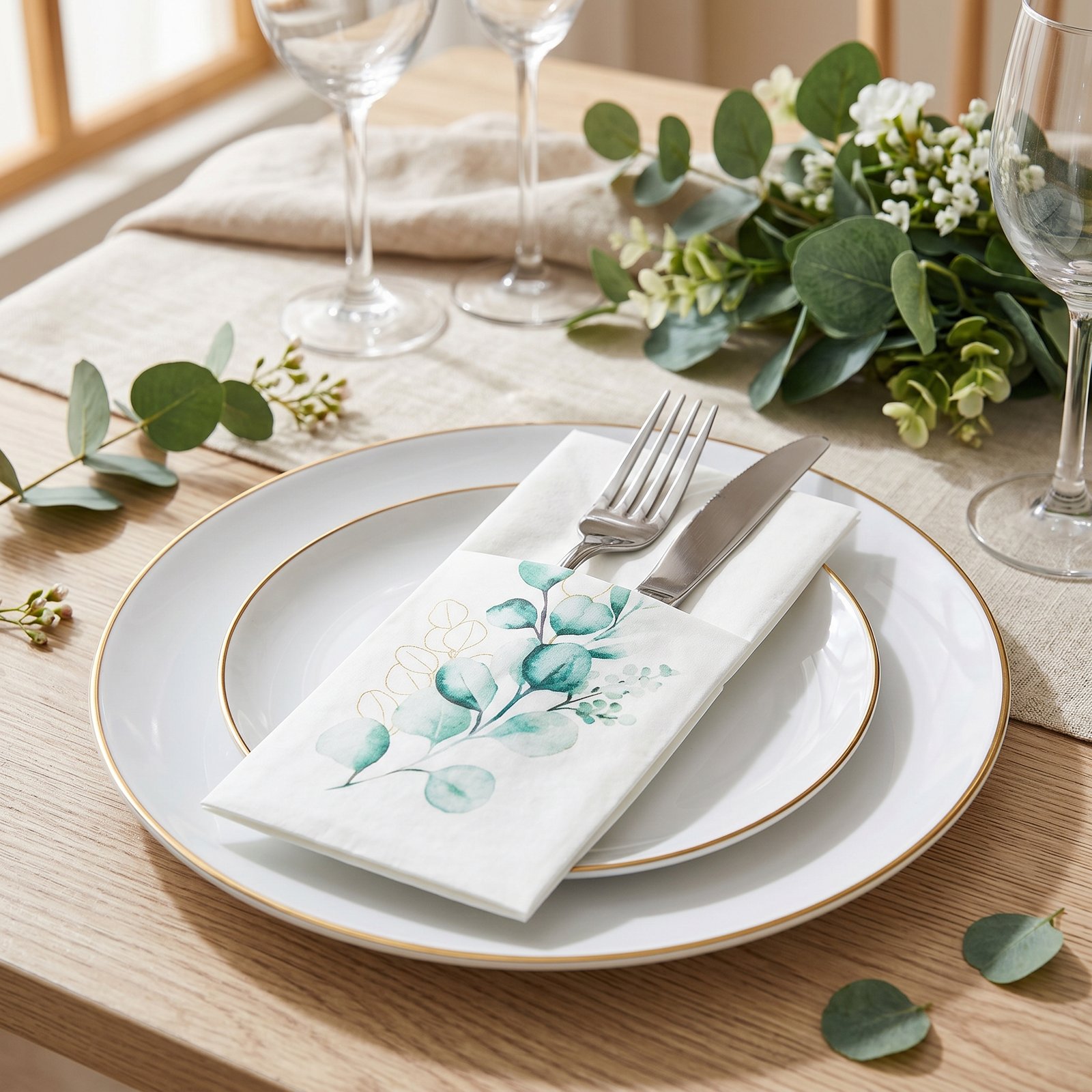 Boasting delicate linen-like paper texture, premium thickened food-grade raw wood pulp, tear-resistant & lint-free with outstanding wet toughness. Exquisite watercolor eucalyptus & golden line leaf print effortlessly creates tranquil upscale fine dining ambiance for home tables, frees you from tedious repeated laundry work and greatly lightens daily household chores. Soft skin-friendly touch, even eco-friendly printing, no harmful additives, perfectly elevates family daily meals, holiday gatherings, wedding banquets and delicate table arrangements.