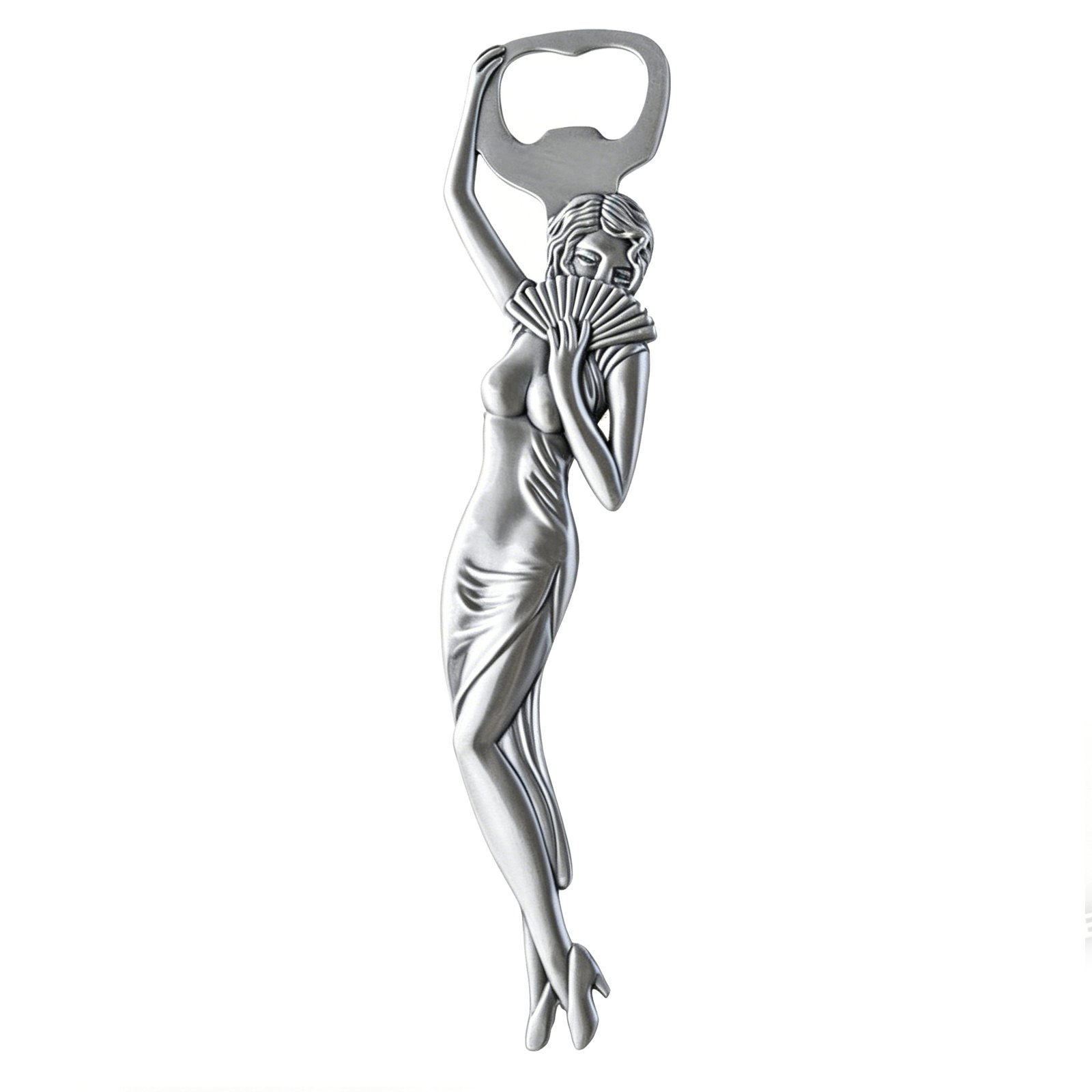 Elegant retro beauty figure bottle opener, available in fan style & hat style designs. Premium zinc alloy with vintage brushed silver finish, exquisite figure carving details, comfortable grip and effortless bottle opening. Unique artistic shape, perfect for home bar decor, party supplies and delicate gift giving.