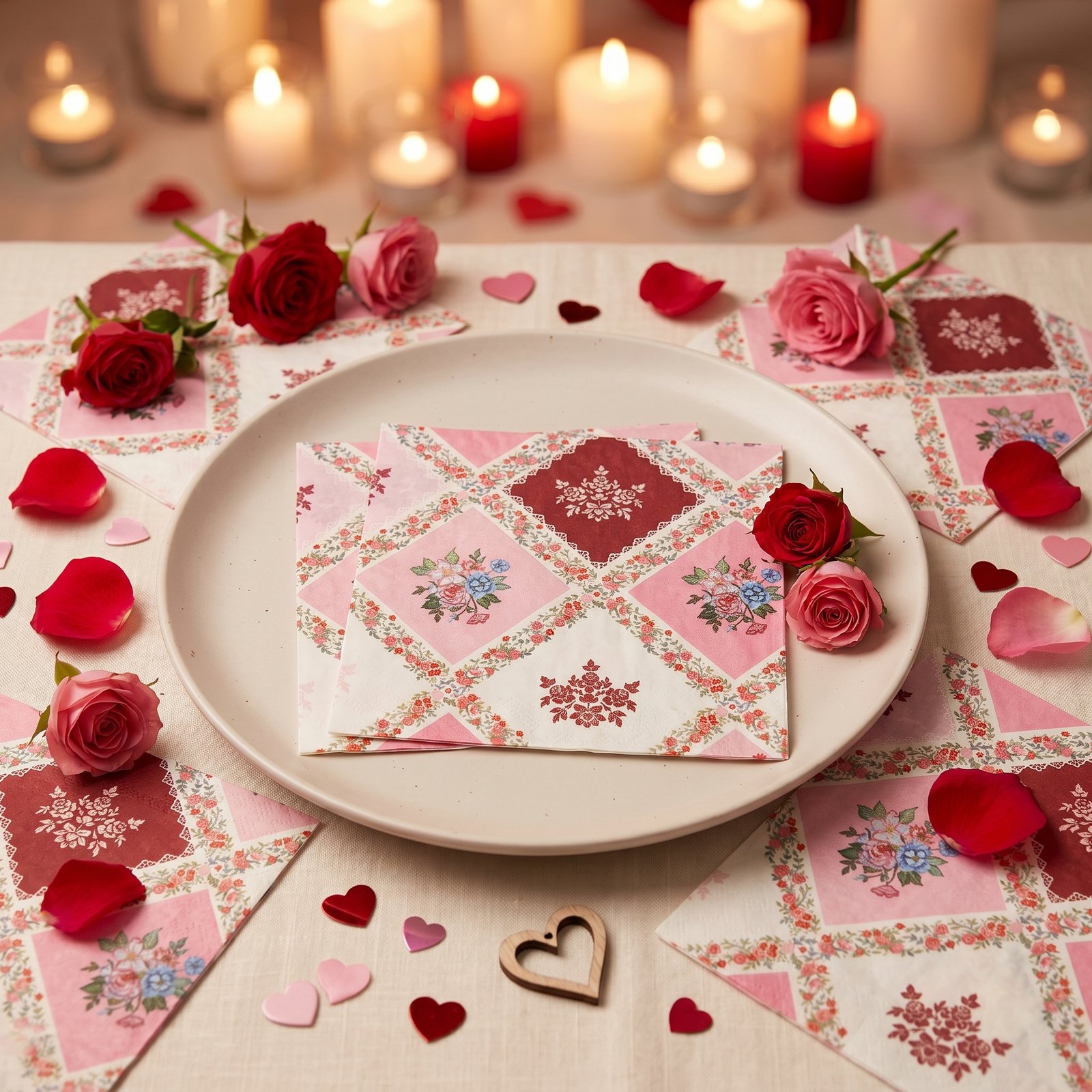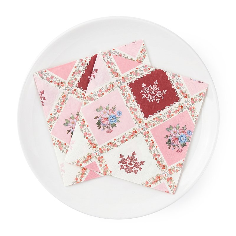 Charming vintage-style paper napkins featuring a delicate patchwork print of pink and red floral motifs with lace-inspired borders. Soft, absorbent and disposable, perfect for tea parties, bridal showers, cottagecore-themed gatherings and everyday romantic table styling.