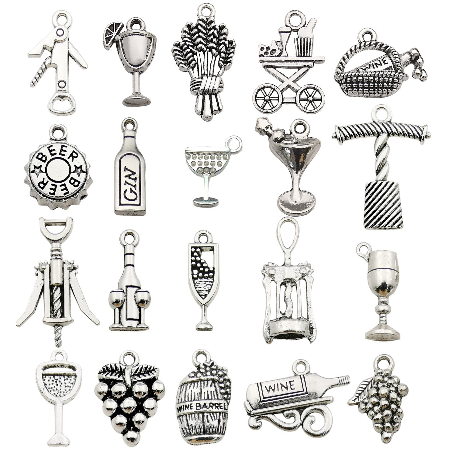 Retro antique silver wine & drink themed alloy pendants, including wine glasses, corkscrews, grapes, wine bottles and bar party elements. Premium sturdy metal texture, delicate vintage matte silver craft, easy to hang and DIY assemble. Ideal for personalized wine glass distinguishing marks at party gatherings and handmade craft decorations.