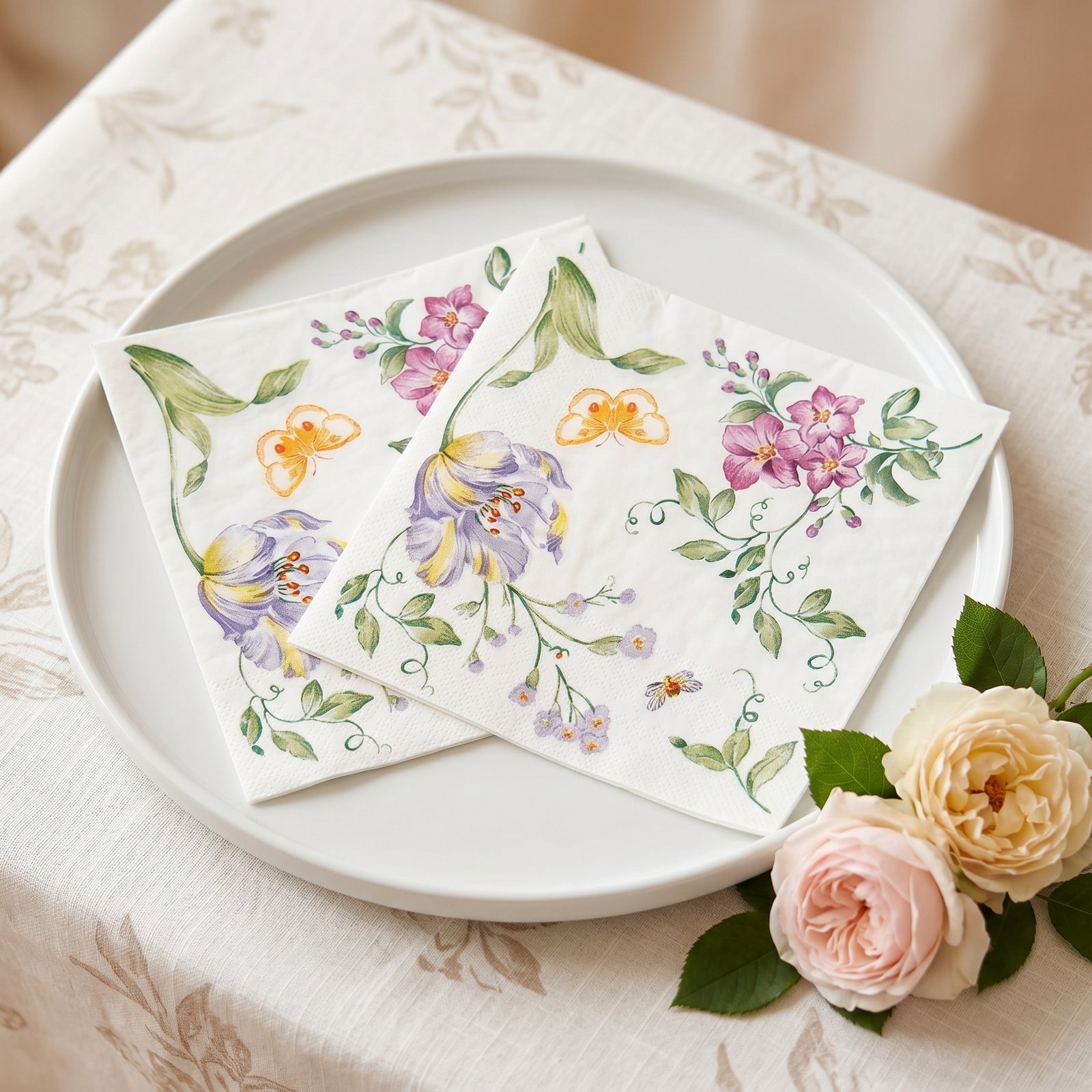 Delicate garden-themed paper napkins featuring watercolor-style purple tulips, pink blossoms, yellow butterflies and a tiny bee, set against a crisp white background. Soft, absorbent and disposable, ideal for spring brunches, tea parties, bridal showers, and everyday cottagecore-inspired table settings.